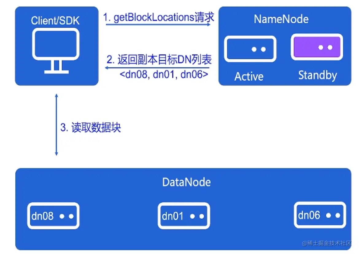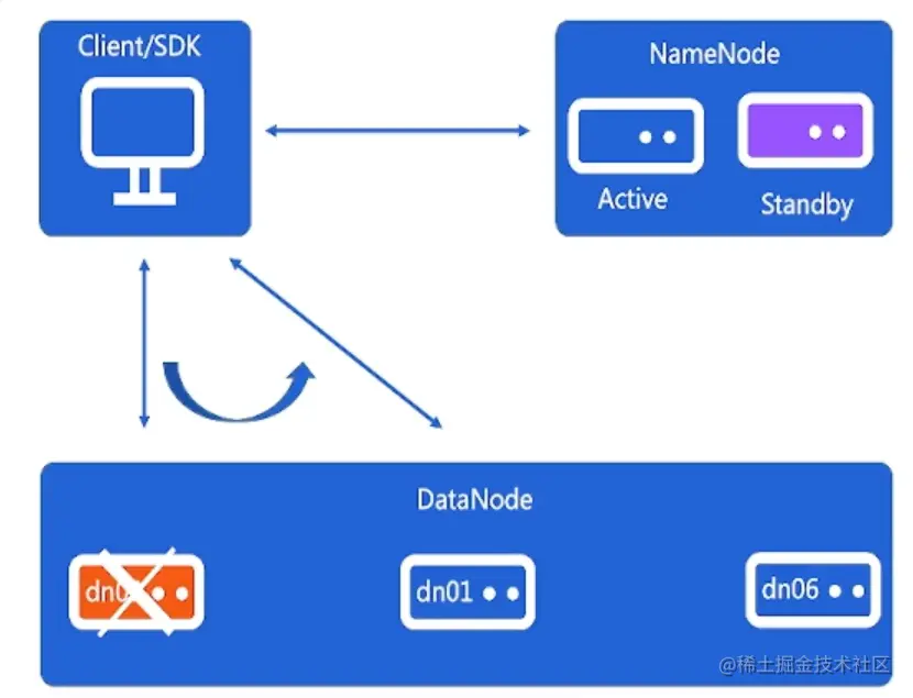 - 高吞吐:Client直接从DataNode读取用户数据,服务端支持海量client并发读写