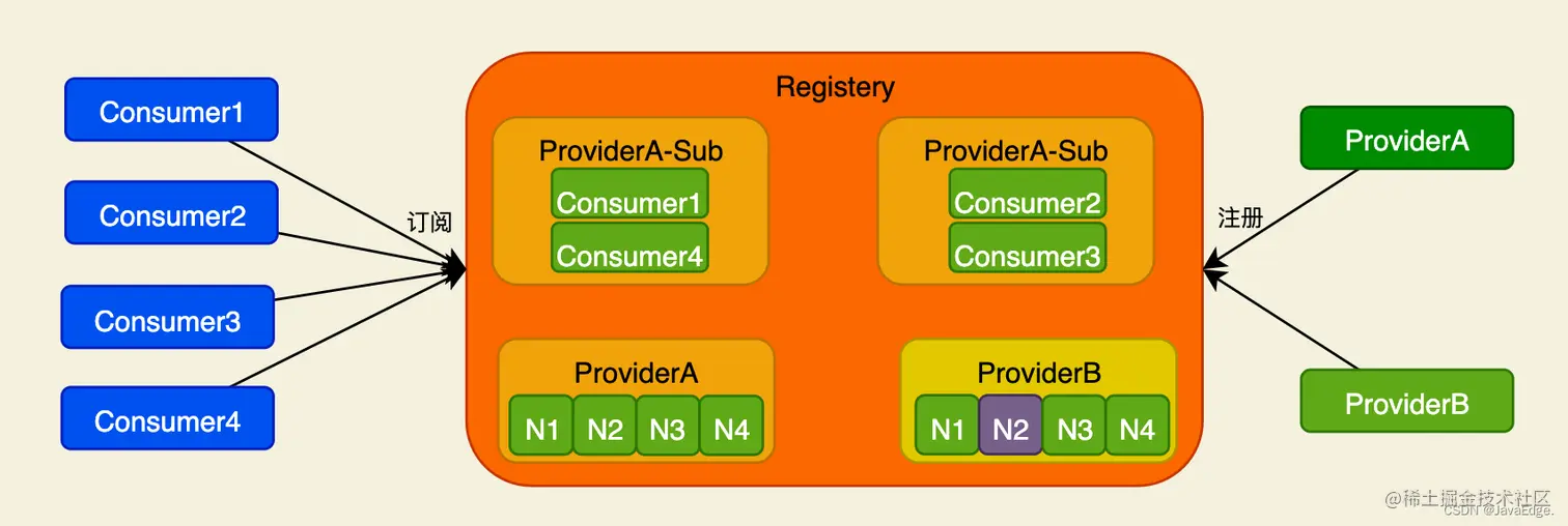 订阅与通知:注册中心内为每个服务提供方建立订阅列表,当服务方节点变更时通知所有订阅该服务的消费方节点。