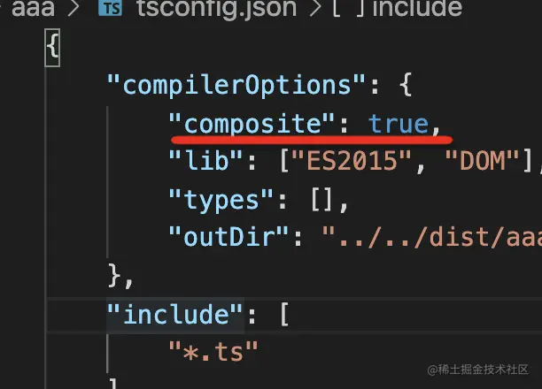 而且,别的地方可能用到这个 project 的类型,所以需要生成 d.ts 声明文件,这就是为啥我们没有指定 declaration: true 的配置,但是编译产物里还是有 d.ts。其实这是 composite 选项做的,它设置了 Project Reference 需要的一些编译选项: