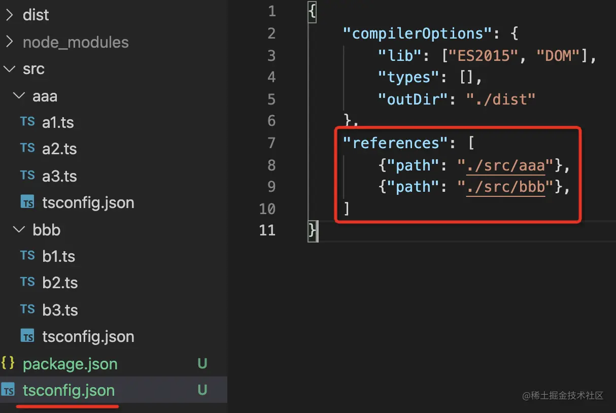 然后在根目录的 tsconfig.json 里加上一个 references 的配置,引入 aaa 和 bbb:
