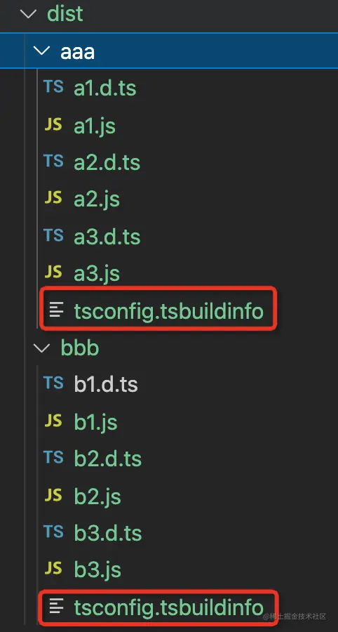 这样再执行 tsc --build 进行编译,你会发现编译结果多了 .d.ts 的声明,还多了 tsconfig.tsbuildinfo 的文件: