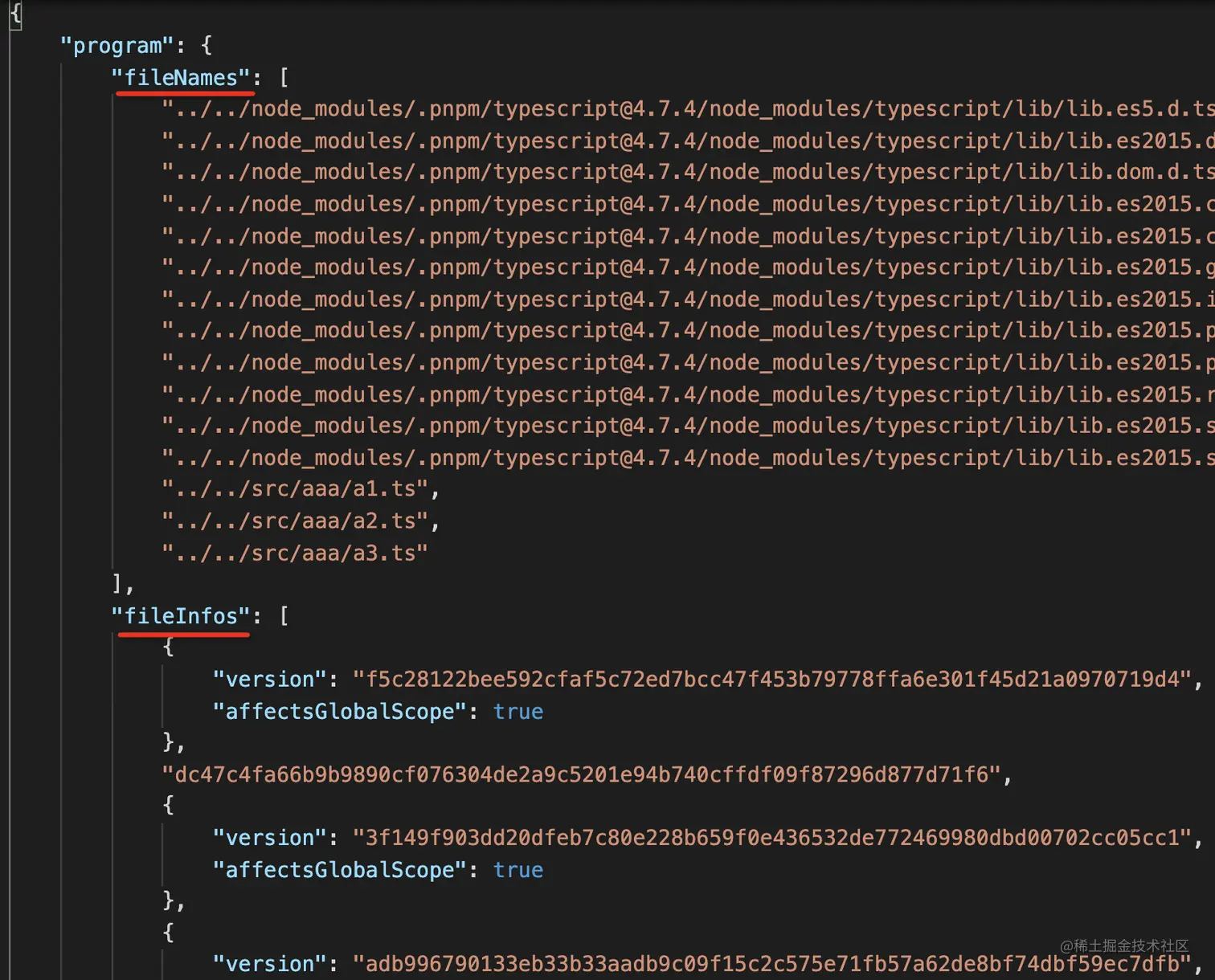 打开 tsconfig.tsbuildinfo 看一下,会发现它记录了编译了哪些文件,还记录了这些文件的 hash 值:
