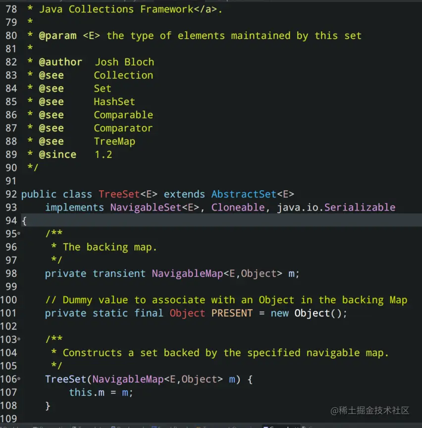 TreeSet 是一个具有唯一元素的二叉树的集合,又被翻译为 树集。Java 中的 TreeSet 类是 Java 集合框架的一部分,从 Java 6 开始,它实现了 NavigableSet 接口(这个接口增加了几个查找元素以及反向遍历的便利方法),从而扩展了 SortedSet 集合。