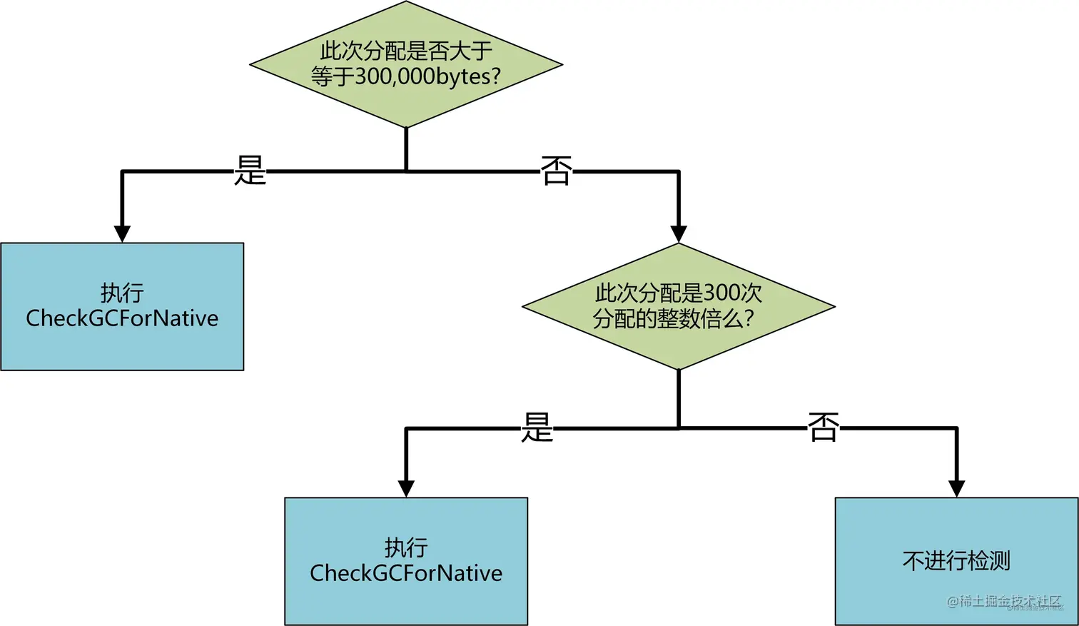 CheckGCForNative函数。该函数内部会统计native内存分配的总量,判断其是否达到GC触发的阈值。如果达到的话则触发一次GC。 - 此次分配是否是300次分配的整数倍。这个判定条件用于限定