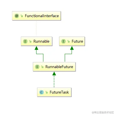 由关系图可以看到,FutureTask 除了实现 Future 接口外,还实现了 Runnable 接口,因此,FutureTask 可以交给 Executor 执行。也可以由调用线程执行执行 FutureTask.run() 方法。