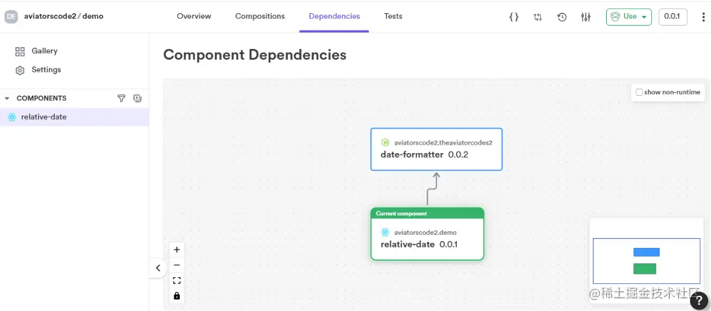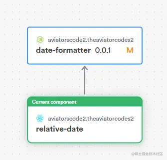 当你点击依赖性按钮时,你会看到一个依赖性图表,显示该 相对日期组件目前正在使用当前版本的 日期格式组件的当前版本,即0.0.1