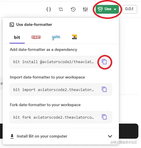 对于每一个创建并导出到比特云的组件,比特提供了一个CLI命令列表,你可以用它来分叉、导入或安装该组件到你的工作区。