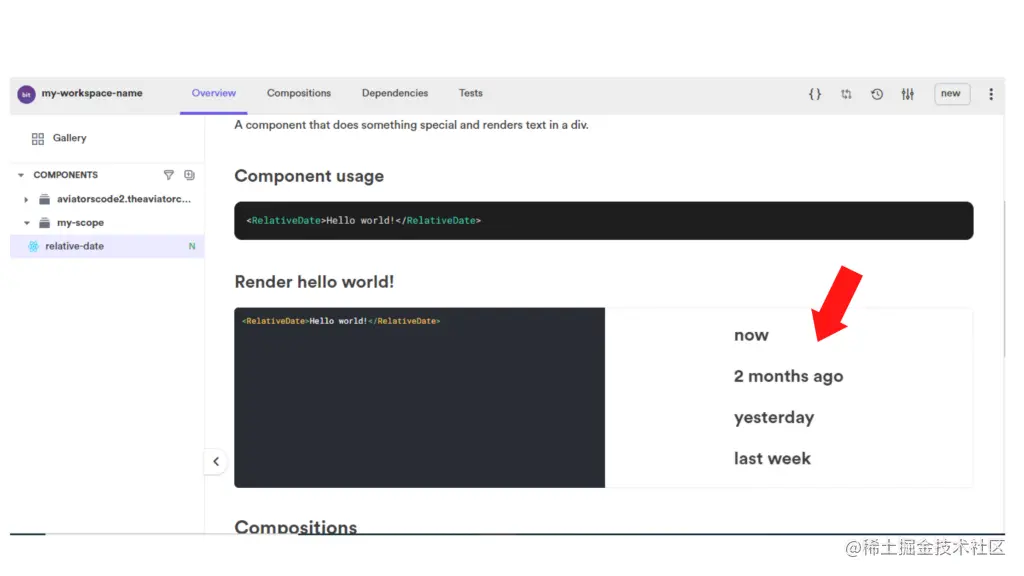 为了使用函数组件,使用导入语法将其导入到你需要的文件中。在本例中,我们需要把它导入到 relative-date.tsc文件中。