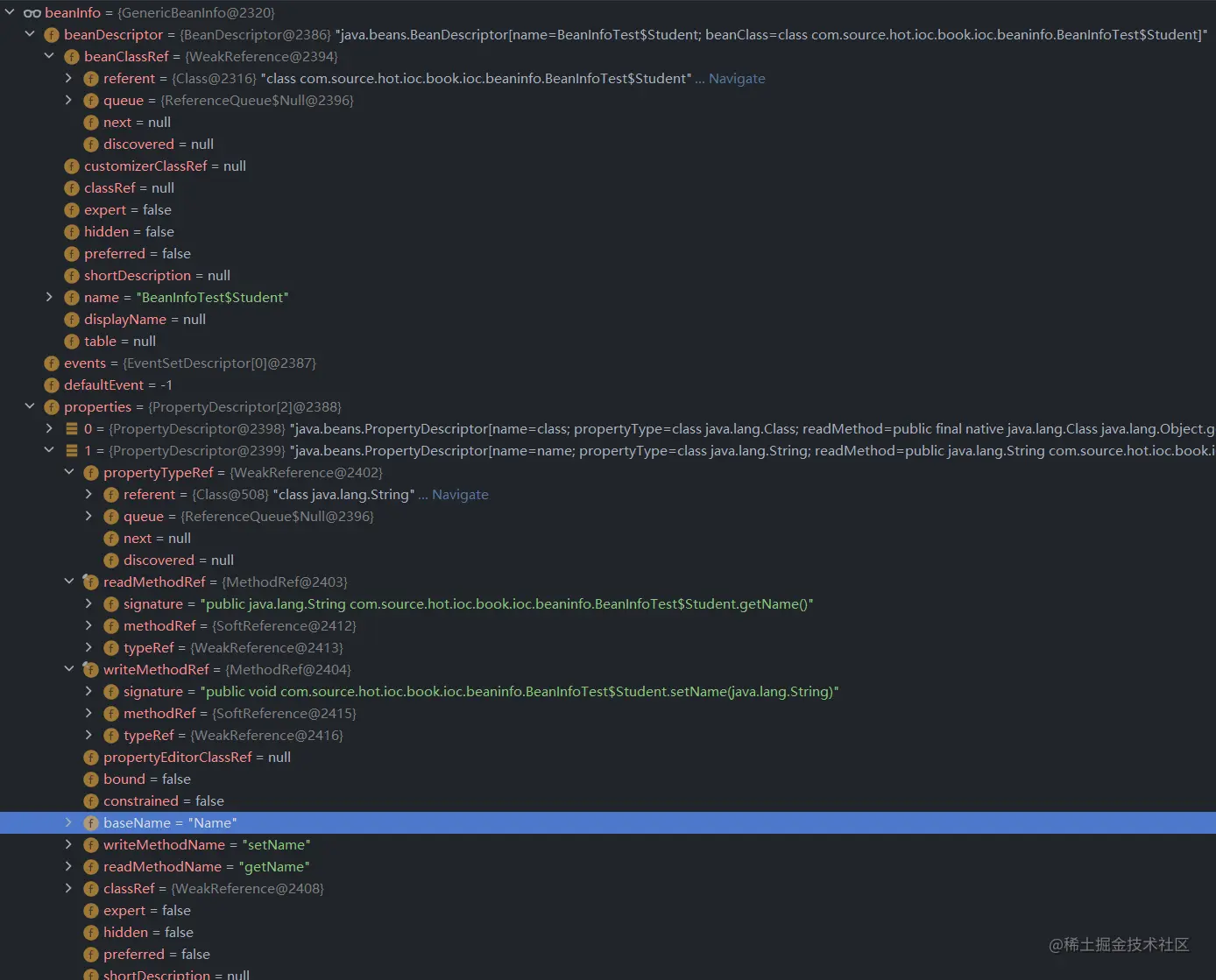 在 Spring 中我们可以看到 BeanInfoFactory 该接口可以用来获取 Class 对应的 BeanInfo 对象,在 CachedIntrospectionResults 中也有相关的成员变量作为信息存储,其他地方还有笔者就不再这里都去搜索了,各位可以自行查阅。