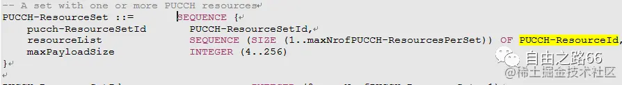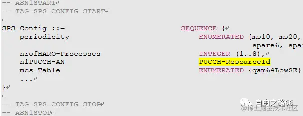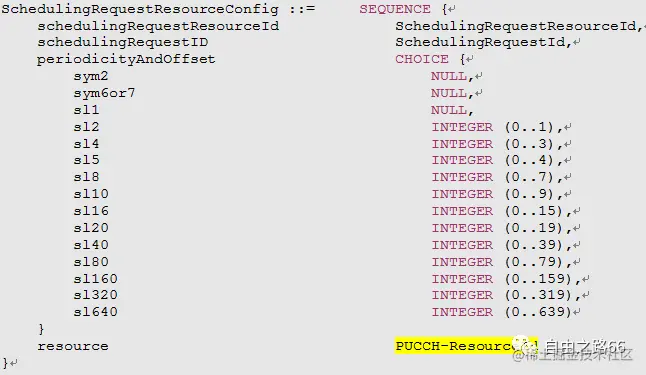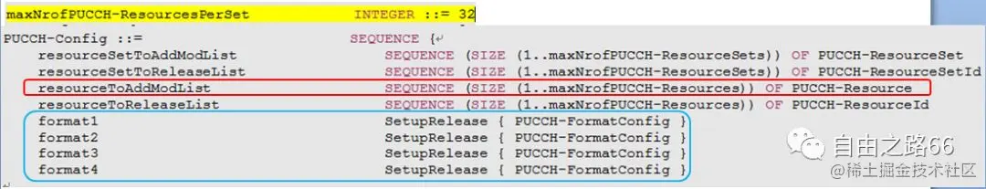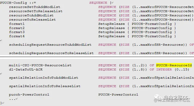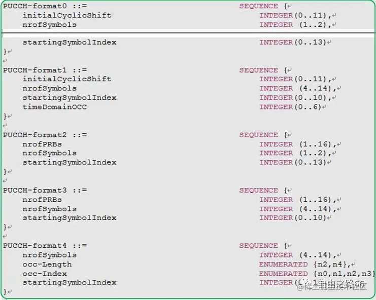 在PUCCH-Config中最多配置32个PUCCH-Resource,在PUCCH-Resource中会指示PUCCH format,起始RB位置,是否跳频指示等信息。PUCCH format的其他信息信息例如最大码率(maxCodeRate),是否需要进行repetition(nrofSlots),是否使能Slot间跳频(interslotFrequencyHopping),是否支持HARQ-ACK与CSI一起发送(simultaneousHARQ-ACK-CSI)。