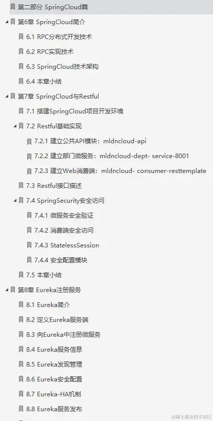 微服务架构的演进并非一蹴而就,过于保守或激进都不是解决之道。长期修行,苦练内功,或许才是微服务架构的前路方向。 2022 年,微服务这一持续多年的话题热度依旧:以 Spring Cloud、Dubbo 为代表的服务框架依然在持续进化,并加速奔向云原生;Service Mesh 这一云原生、微服务双圈“网红”依然在迷雾中砥砺前行。对大多数企业而言,面对云原生和微服务技术的蓬勃发展,不免有些疑惑:一边是成熟演进的服务框架,一边是代表未来方向的 Service Mesh,企业的架构演进方向究竟该如何选择? Java微服务架构是当下最流行的软件架构设计方案,微服务架构的出现,很好地适应了这个时代对快速发展变化的要求。 此文档用140个实战案例,完美的演示了微服务的方方面面,从SpringBoot篇、SpringCloud篇、微服务辅助篇都在完美的诠释微服务。需要完整版的朋友可以点进去了解一下,点击——【传送门】——即可! Java微服务架构实战:SpringBoot/Cloud+Docker+RabbitMQ 主要是分为三部分来进行讲解的,每部分都有详细的介绍: 目录一览 第一部分:SpringBoot篇 第1章SpringBoot编程起步 第2章SpringBoot程序开发 第3章Thymeleaf模板渲染 第4章SpringBoot与Web应用 第5章SpringBoot服务整合