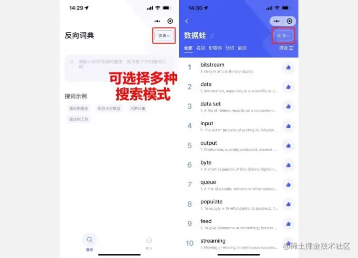 在微信小程序里就有【Wantwords】这个全面的英语词典小程序,它是清华大学团队开发的反向词典,输入中文语义就能查询你想知道的词,还支持汉英词典、英英反向词典及英汉反向词典,特别适合英语基础不是很好的小伙伴们去使用。