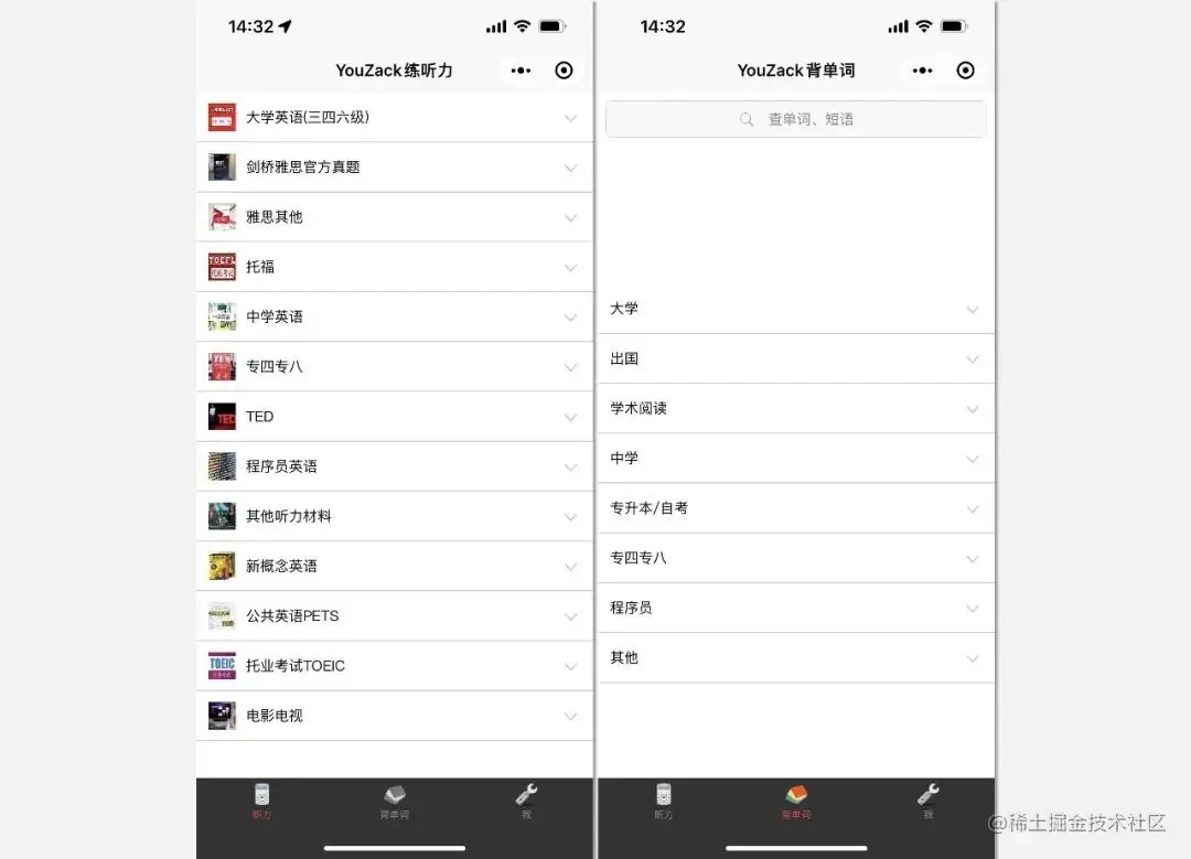 特别是有英语考级需求的小伙伴一定要去关注【YouZack】这款微信小程序,它可以说是一款超宝藏的免费练听力+背单词小程序了,涵盖从初中到大学四六级、考研雅思等各种内容,操作还非常的简洁好用。