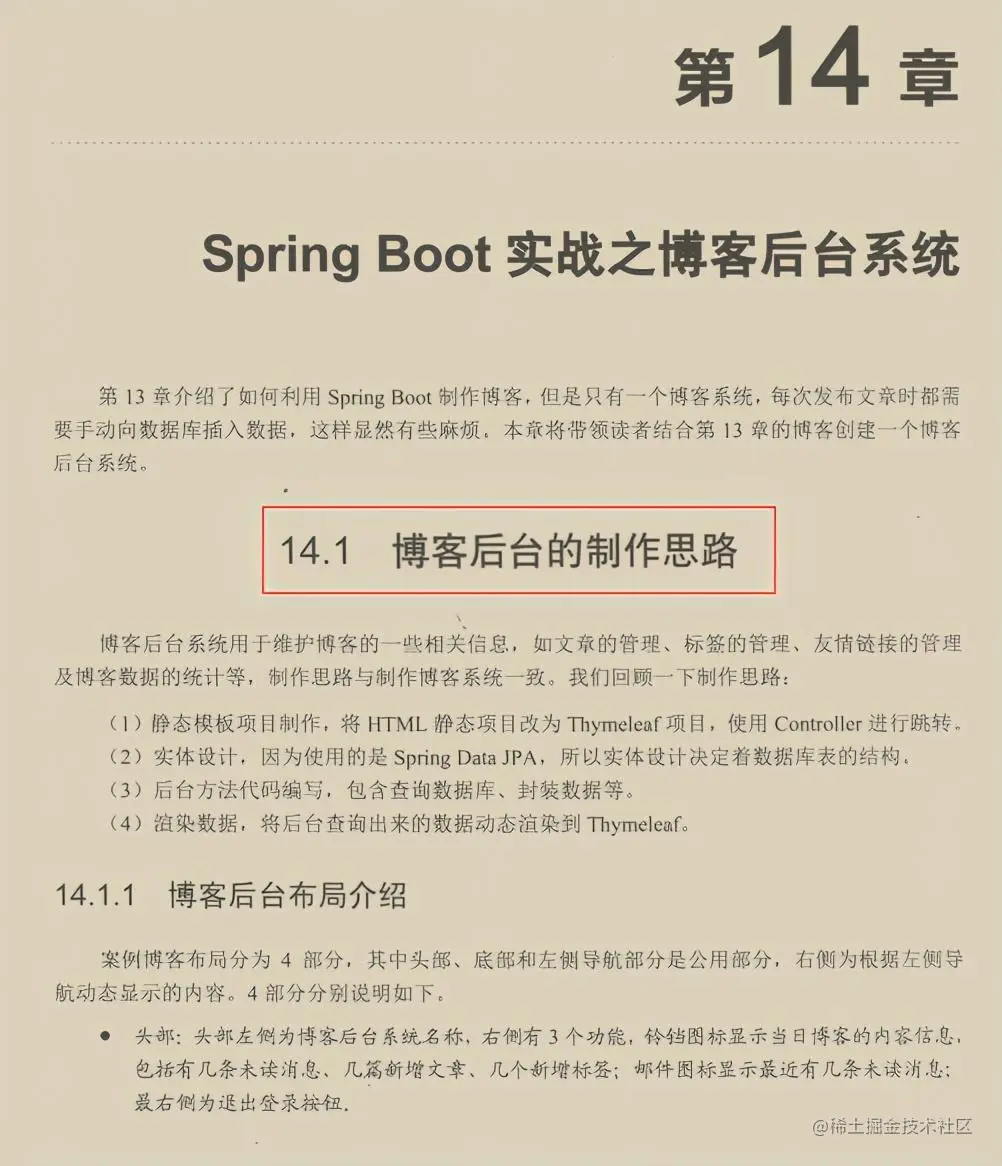 第13章介绍了如何利用Spring Boot 制作博客,但是只有一个博客系统,每次发布文章时都需要手动向数据库插入数据,这样显然有些麻烦。本章将带领读者结合第13章的博客创建一个博客后台系统。