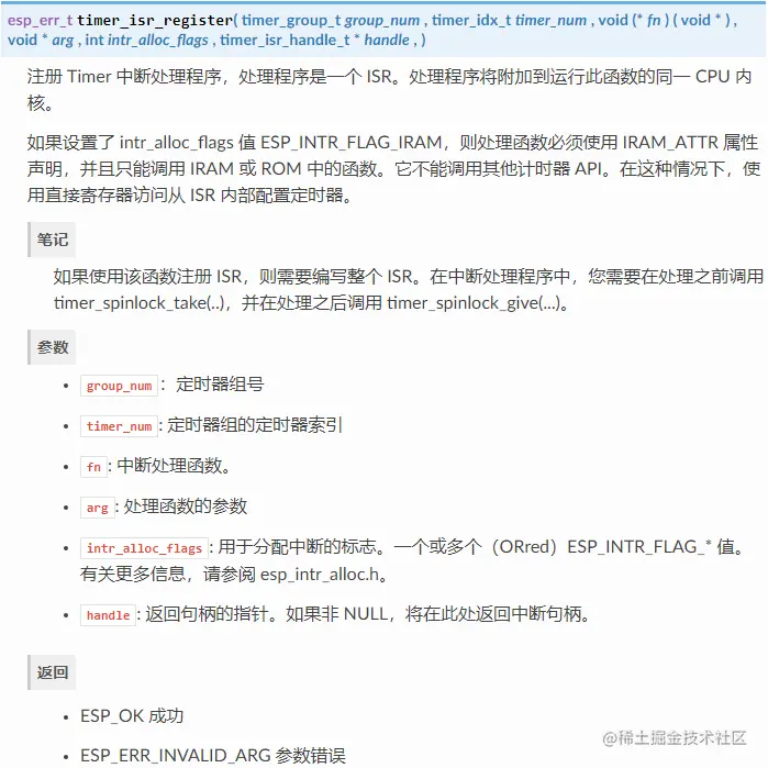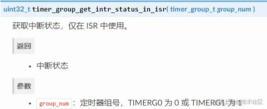 void IRAM_ATTR timerIsr(void *arg){ timer_spinlock_take(0); // 获取自旋锁 /* 代码区一 */ timer_group_clr_intr_status_in_isr(0, 0); timer_group_enable_alarm_in_isr(0, 0); /* 代码区二 */ timer_spinlock_give(0); // 释放自旋锁 }注意:必须显式清除中断标志,以及重新使能中断。如上代码区一和代码区二之间的两个函数。(两个函数参数都是定时器组索引和定时器索引)② 注册中断 调用函数