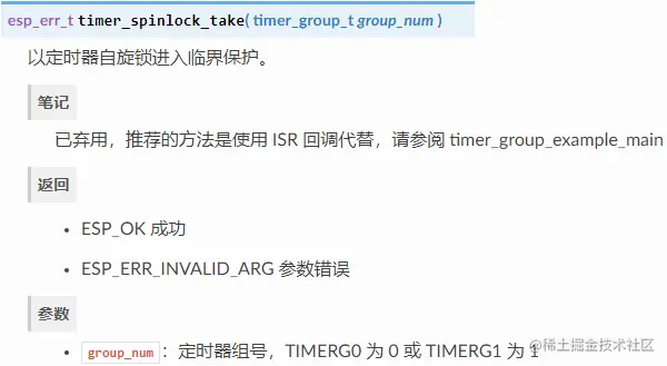 timer_isr_register()配置 例如,为定时器组0中的定时器0配置一个完整的ISR程序timer_isr_register(0, 0, timerIsr, &config, ESP_INTR_FLAG_IRAM, NULL); - 获取自旋锁