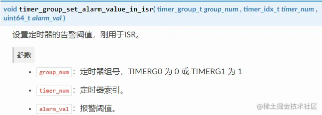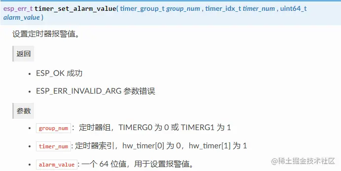 要设置中断报警,请调用该函数timer_set_alarm_value(),然后使用启用报警timer_set_alarm()。报警也可以在定时器初始化阶段启用,当timer_init()被调用时。
