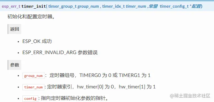 首先,应该通过调用函数timer_init()并传递一个结构体timer_config_t来定义定时器应该如何操作来初始化定时器。特别是,可以设置以下定时器参数: