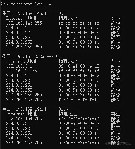 在 Windows 或 macOS 中,可以在终端中输入命令arp -a查询ARP 表: