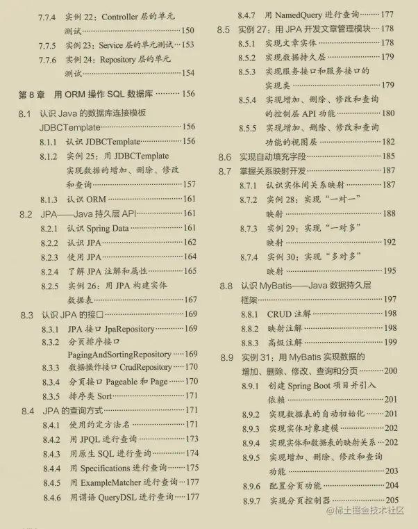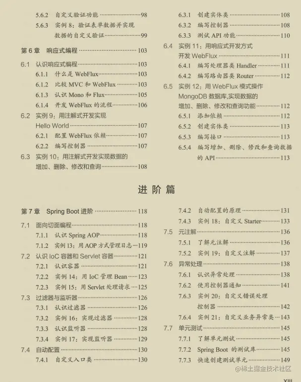 基于Spring Boot 2.X版本,采用“知识点+实例”的形式编写,通过“58个基于知识的实例+2个综合性的项目”。全面深入地讲解了Spring Boot 的主要技术原理和应用。(由于篇幅到这里已经很长了,这份文档就只能以截图目录的方式展示出来了)