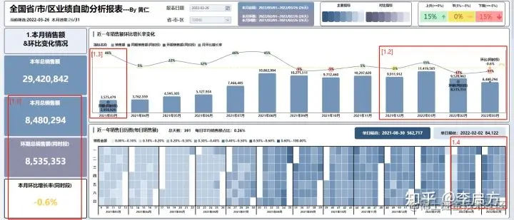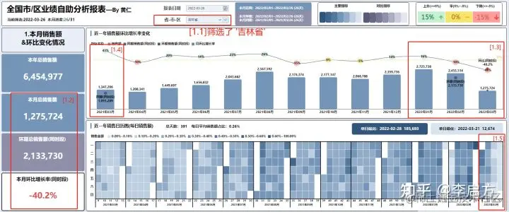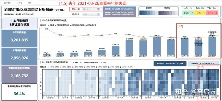 这时全国老大想知道是不是有2,3月就是有表现不好的规律,上图[1.5]老大筛选去年同时间'2021-03-26',这整份报表就'回溯'到当时的情况。可以通过筛选回到任何时间的报表分析,而不用再找数据部门要,双赢。