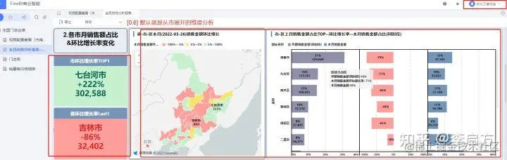 至此,其实全国老大在这份报表可以继续'筛选+联动+钻取'去分析'吉林省',且目前只用报表分析的2个版块,下面还有4个版块可以深入分析这2个省的问题。