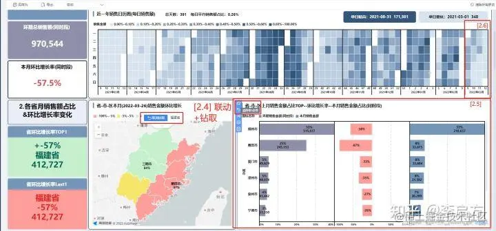 上图[2.4] 老大想要知道'福建省'的具体情况,使用了'联动+钻取',看到'福建省'的沿海城市销售额都下降了。[2.5] 贡献了'福建省'2月的53%销售额的'福州市' 环比下降了58%, 贡献了'福建省'2月的25%销售额的'莆田市' 更是环比下降了87%,贡献第二的下降最多。[2.6]'福建省'也是22年3月的后2周表现得很差。