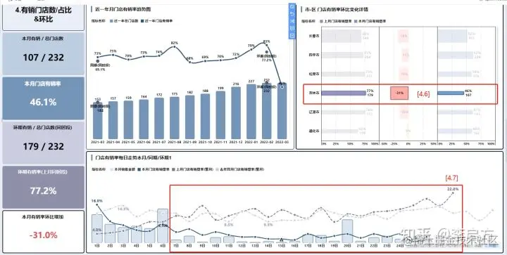 上图[4.1] [本月有销率环比增加]为-15.5%,[4.2] 同比(同时段)的[门店有销率]也有72.4% ,每个月的有销率也比较平滑,所以[本月有销率]55.4真的很异常。