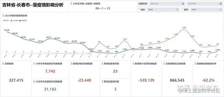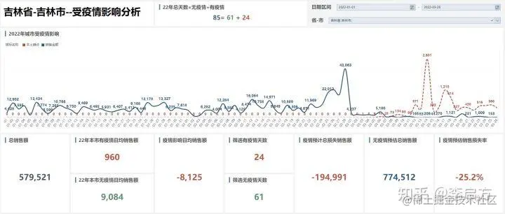 '吉林省'-40%的业绩下滑中,'吉林市'足足-85%的下滑。大家一般都会清楚应该是受到疫情影响。但是这个应该很不会,是怎么个个影响法,具体影响了多少,真的全是疫情的原因?上述的[日常可视化报表]并不能无法证明。