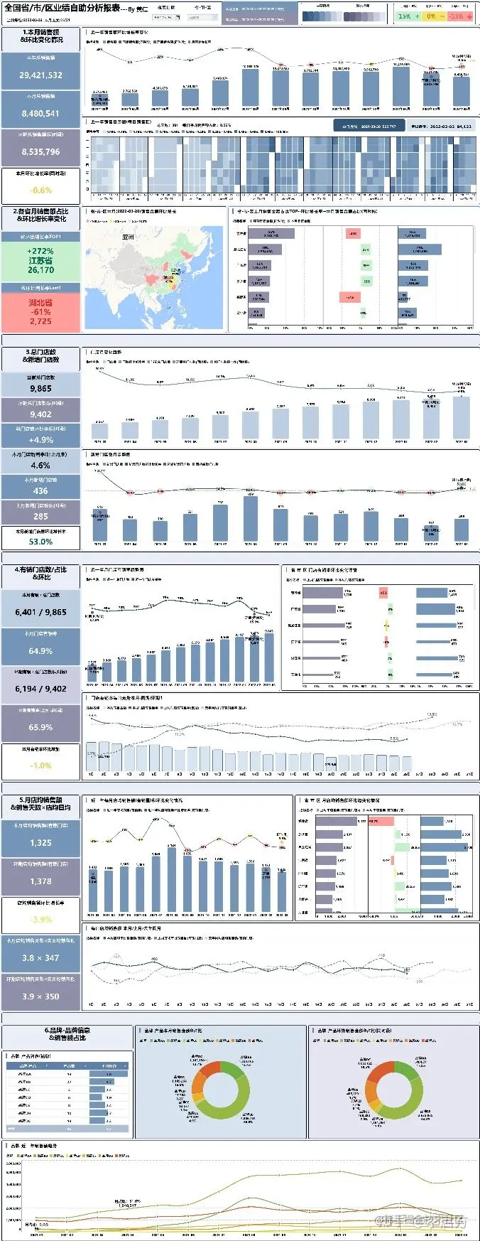 目的:当前,不少零售公司的门店都正在全国高速扩张中,急需一张完整企业经营数据分析报告,让业务人员能从中知道自己业务最近及过去的数据情况, 同时,也让公司管理层快速了解业务情况及数据波动原因,得出解决方案。部分分析报告如下↓↓,数据分析及可视化报告制作工具是FineBI