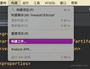 保存后使用顶部菜单栏的构建按钮,选择构建工件