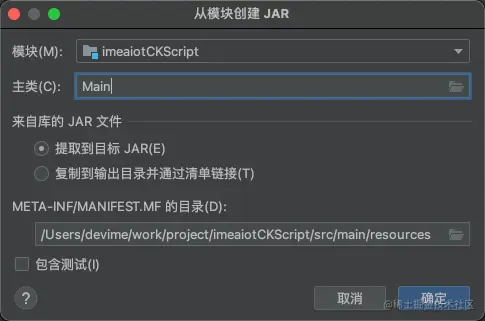 选择你的主类,路径保持默认无需修改,记得选择 提取到目标JAR 否则你的jar包需要依赖其他jar包