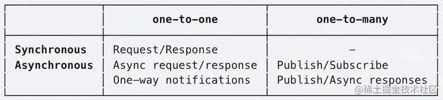 - 同步请求/响应 :服务客户端请求服务并等待响应。服务的紧密耦合是这种交互方式的结果。