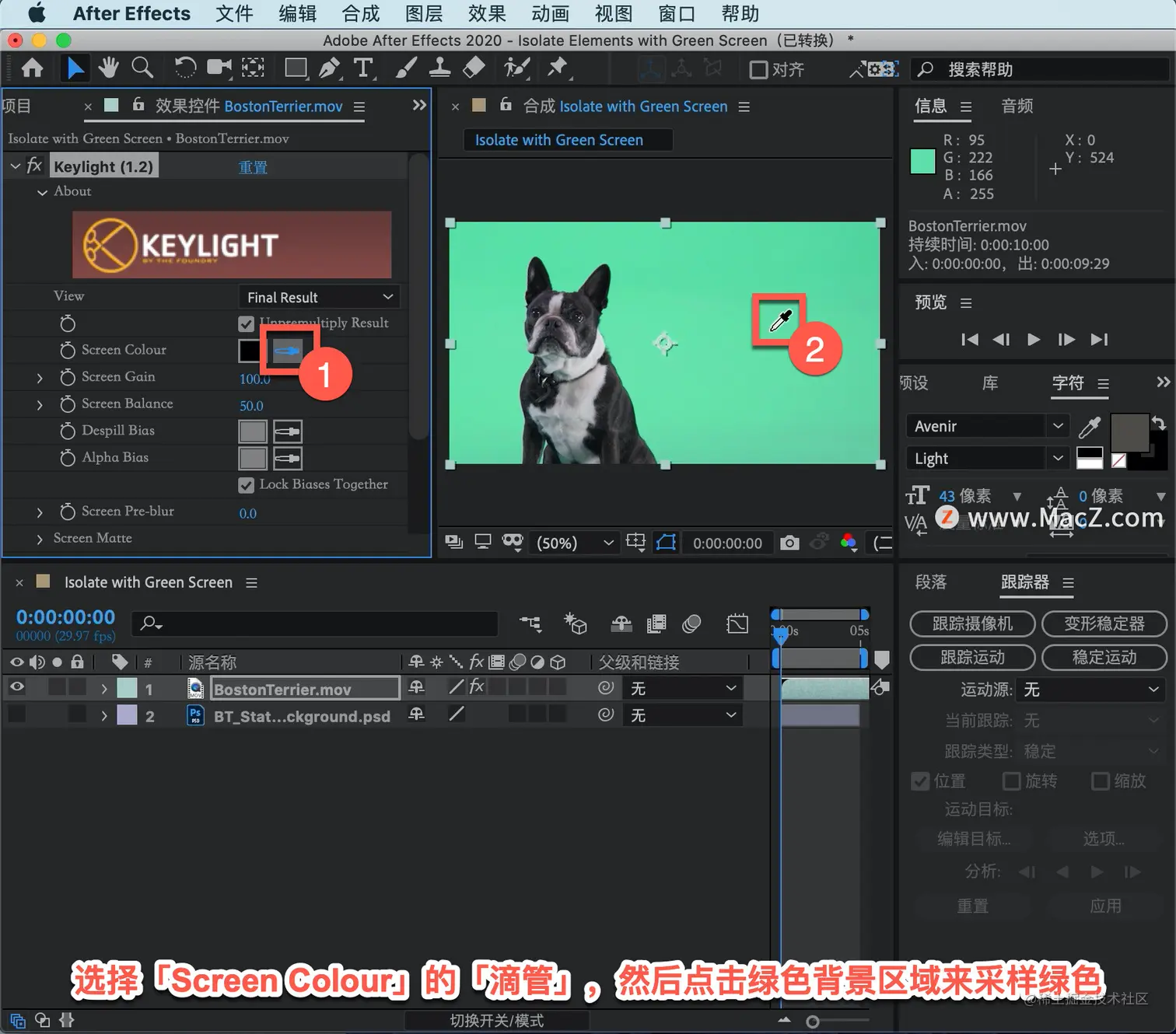 应用 Keylight 的第一件事是设置屏幕颜色。在「效果控件」中点击「Keylight(1.2)」,选择「Screen Colour」的「滴管」,然后点击绿色背景区域来采样绿色,按空格键开始播放。