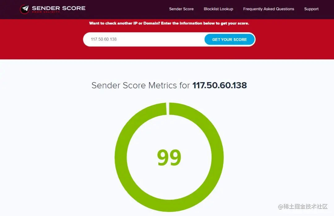 Tips: 第三方给出的信誉度变化很大,且只能用来做参考。经常会发现,SenderScore 给出某个 IP 的评分是 99,但是发出去的邮件仍然在垃圾箱。