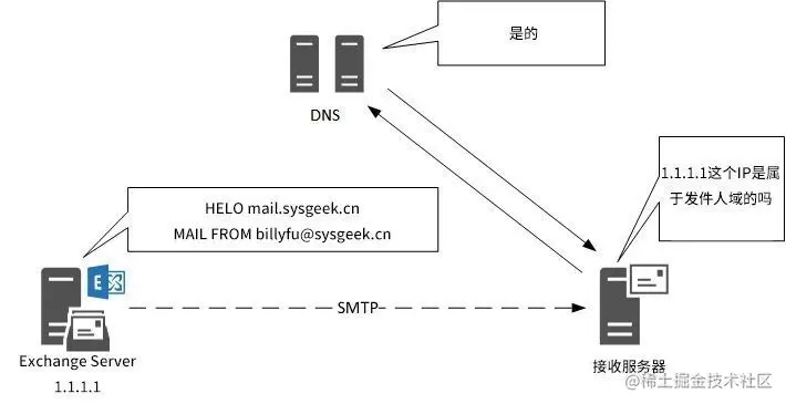 在 SPF 认证期间,收件方会先查询发信域名的 SPF 记录,然后检查发件人的 IP 地址是否被包含在 SPF 记录里面。如果 IP 地址在 SPF 记录里,则 SPF 检查通过;反之则失败。