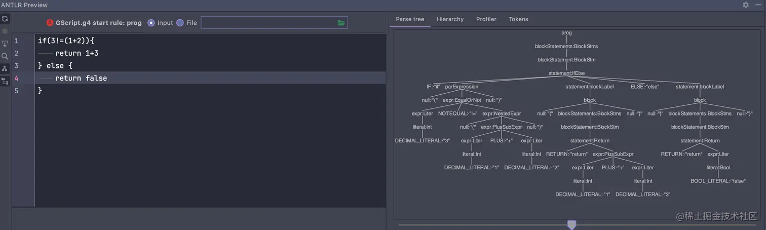 这里也推荐在 IDE 中安装 Antlr 的插件,这样就可以直观的查看 AST 语法树,可以帮我们更好的调试代码。