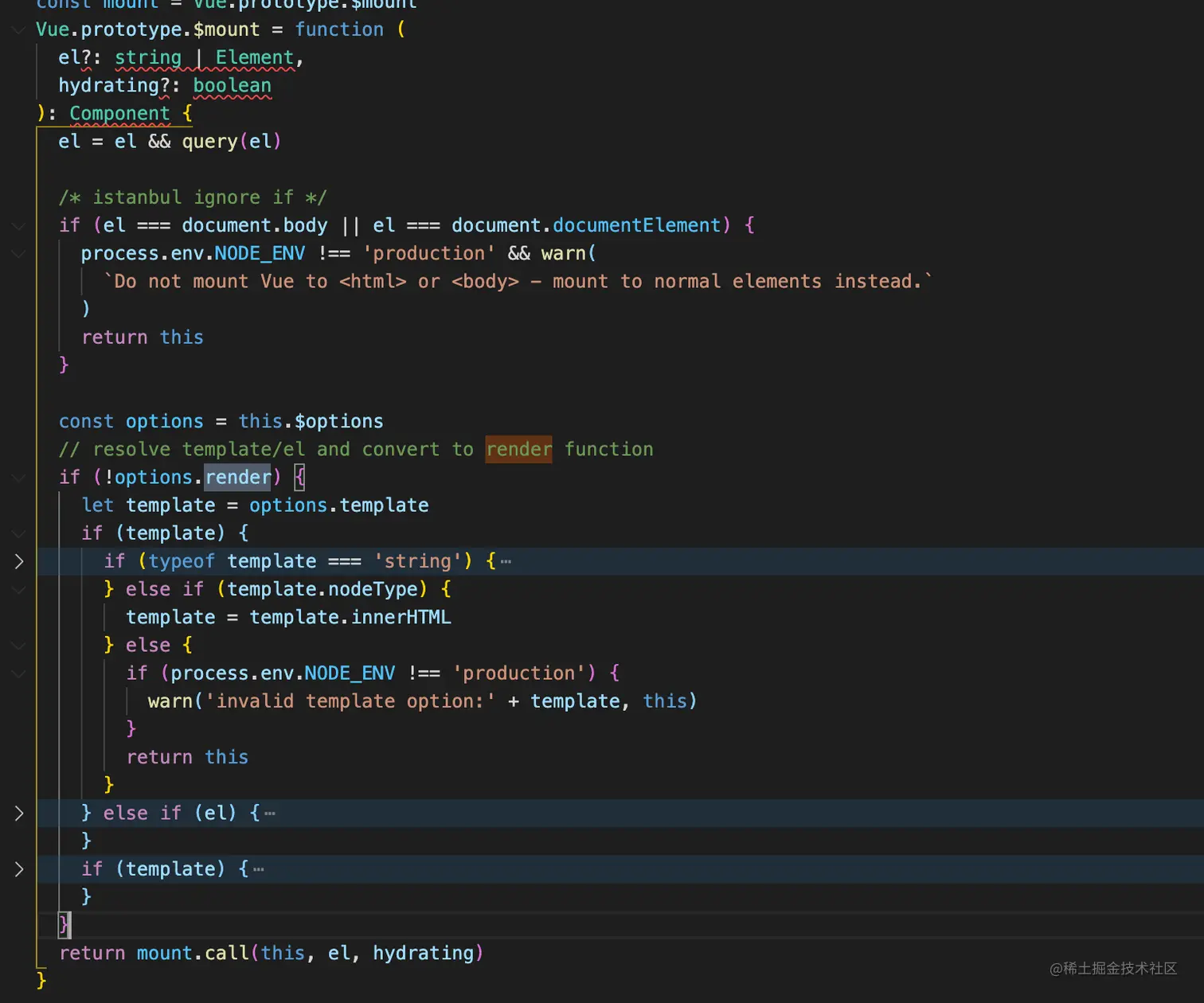 如果发现配置项上有 el 选项,则自动调用 mount 方法,反之,没提供 el 选项则必须调用 $mount