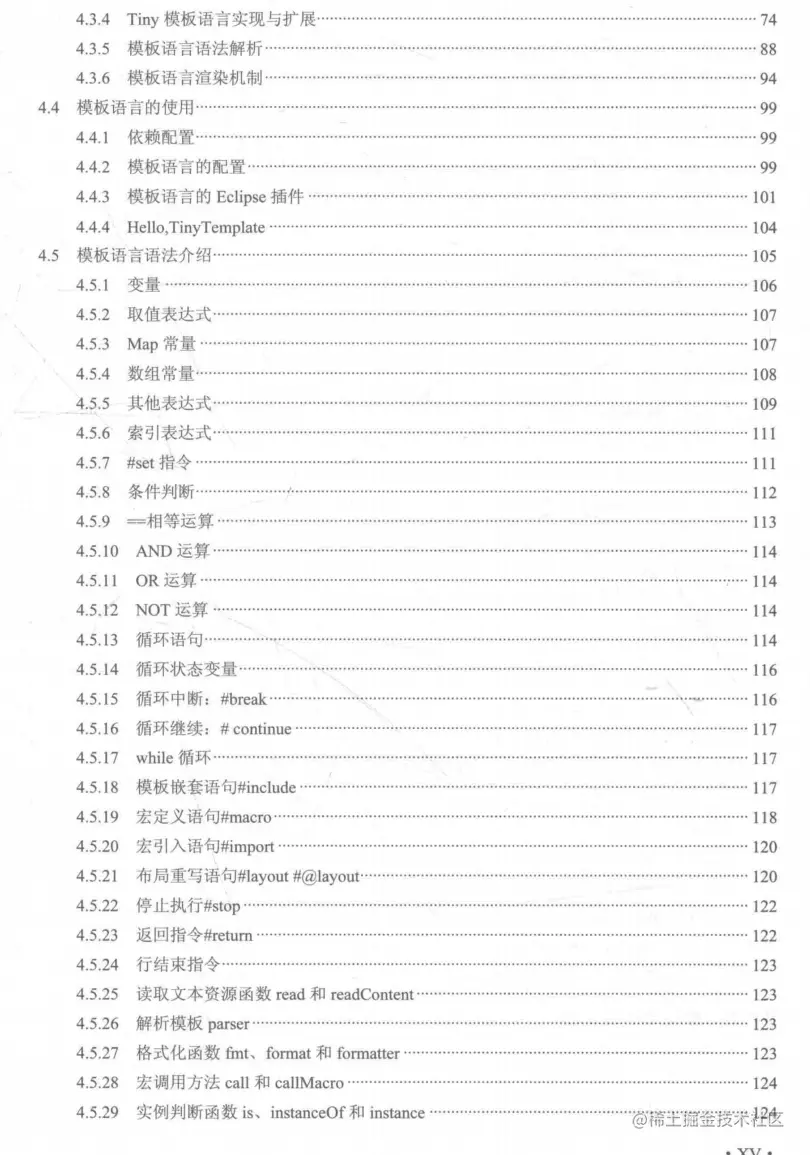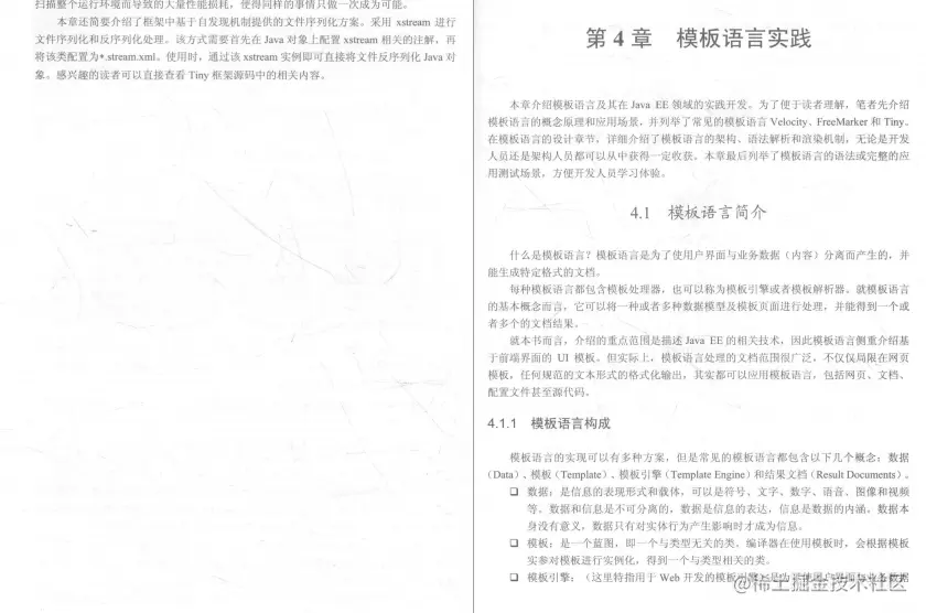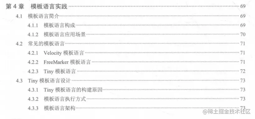 本章介绍了模板语言及其在Java EE领域的实践开发。为了便于读者理解,笔者先介绍模板语言的概念、原理和应用场景,并列举了常见的模板语言Velocity、 FreeMarker 和Tiny,比较了三者的优势和不足。特别是在设计开发的章节,按模板语言的架构、语法解析和渲染机制的顺序,从零开始讲解如何构建一种模板语言。 通过对本章内容的学习,有能力的读者完全可以尝试扩展模板语言。