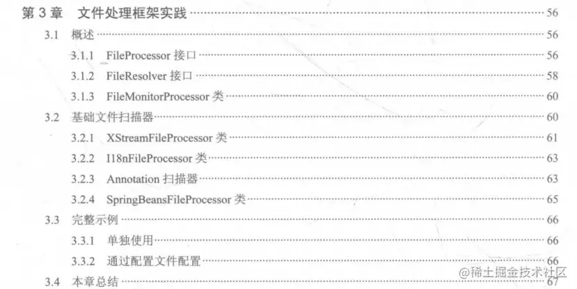 本章介绍了文件处理框架,可以有效地解决Java EE应用模块化导致的各种配置文件分散在不同模块而带来的处理这些资源难度大的问题。在介绍Tiny文件处理框架的过程中,请仔细阅读文件扫描器接口、文件扫描器主入口和定时扫描器的介绍,理解框架如何把文件的扫描、文件的变化、文件的遍历等与文件的实际处理分离,体会“开-闭"原则的具体运用。