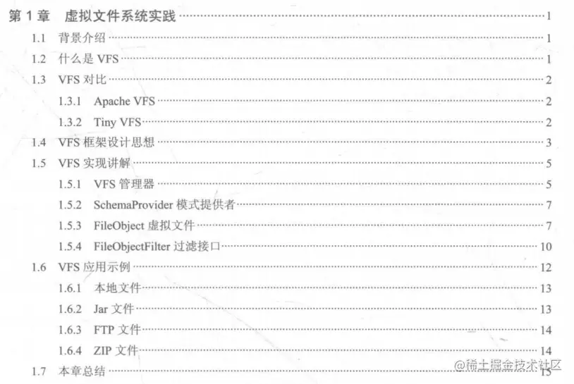 本章从Apache VFS框架存在的内存泄露Bug说起,引入企业级应用常见的虚拟文件系统的概念,并介绍了Apache VFS框架和TinyVFS框架。另外,还讲解了VFS的设计思想,介绍了VFS管理器、虚拟文件接口和模式提供者等概念,并给出本地文件、JAR和FTP的实践用例。