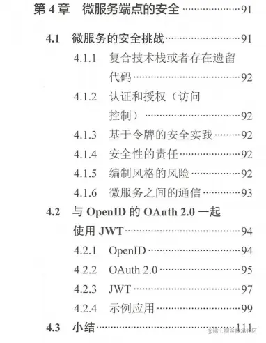 第4章会讨论使用微服务架构时可能会遇到的常见安全问题和安全挑战。可以通过引入JWT、OpenID 和OAuth 2.0来提高微服务架构的安全性。