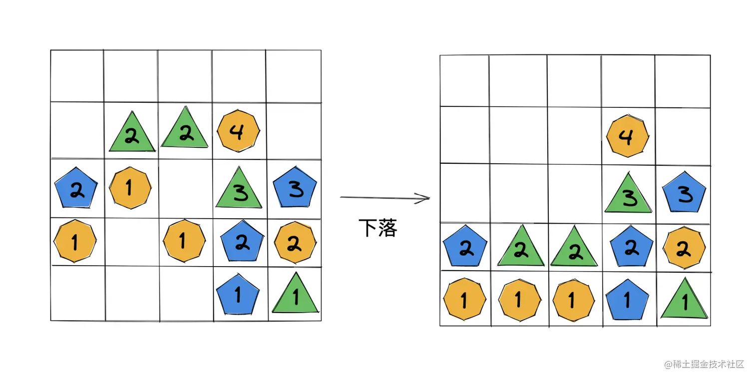 获取表格中的一列,然后从下向上依次检查每个格子,空白位置跳过,如果格子里有宝石,就为这个宝石设置一个编号,编号依次增加 1,这样检查完一列之后,下落宝石的目标位置就知道了。接着,像这样检查表格中的每一列,当所有的剩余宝石都编号完成后,再统一进行下落处理。