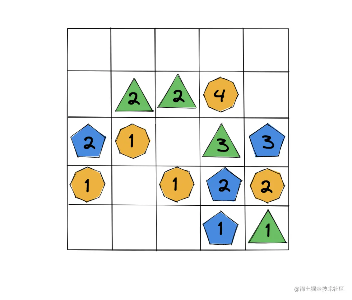 第一列有两个宝石,第二列两个宝石,第三列有两个宝石......貌似是有点儿规律了。忽略掉空白位置,我们从每一列的下方开始,向上寻找宝石,每找到一个宝石就为它设置一个编号,宝石的编号依次增加。