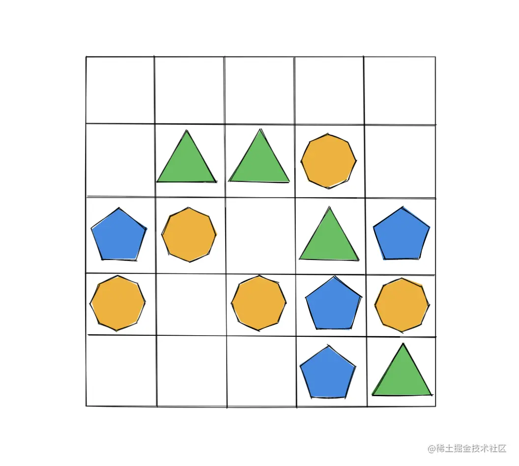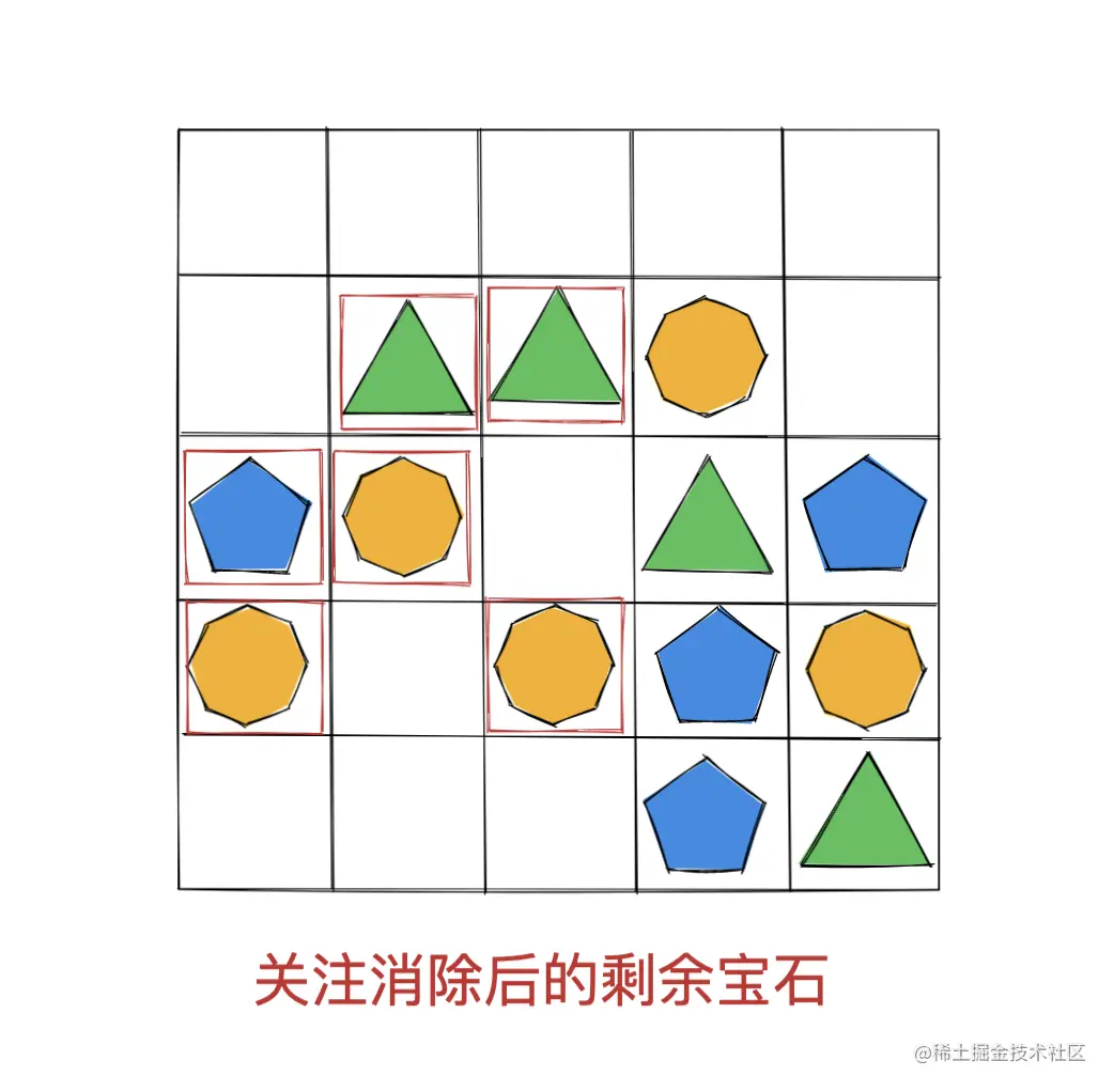 以空白位置为关注点的话,找不到明显的规律。那我们就试着切换一下关注点,关注消除后剩余的宝石。