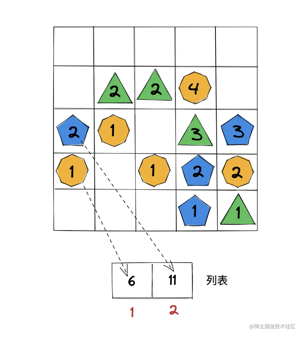 如图,以第一列为例,从下向上依次查看每一个格子,第一个格子是空白位置,跳过。第二个格子有宝石,将第二个格子的宝石的索引加入到列表中(列表的第一个位置),接着第三个格子有宝石,将第三个格子的宝石的索引加入到列表中(列表的第二个位置)。检查完一列后,在最终的列表中,项的内容是要下落方块的索引,位于第几项,就是下落方块的目标位置行号。