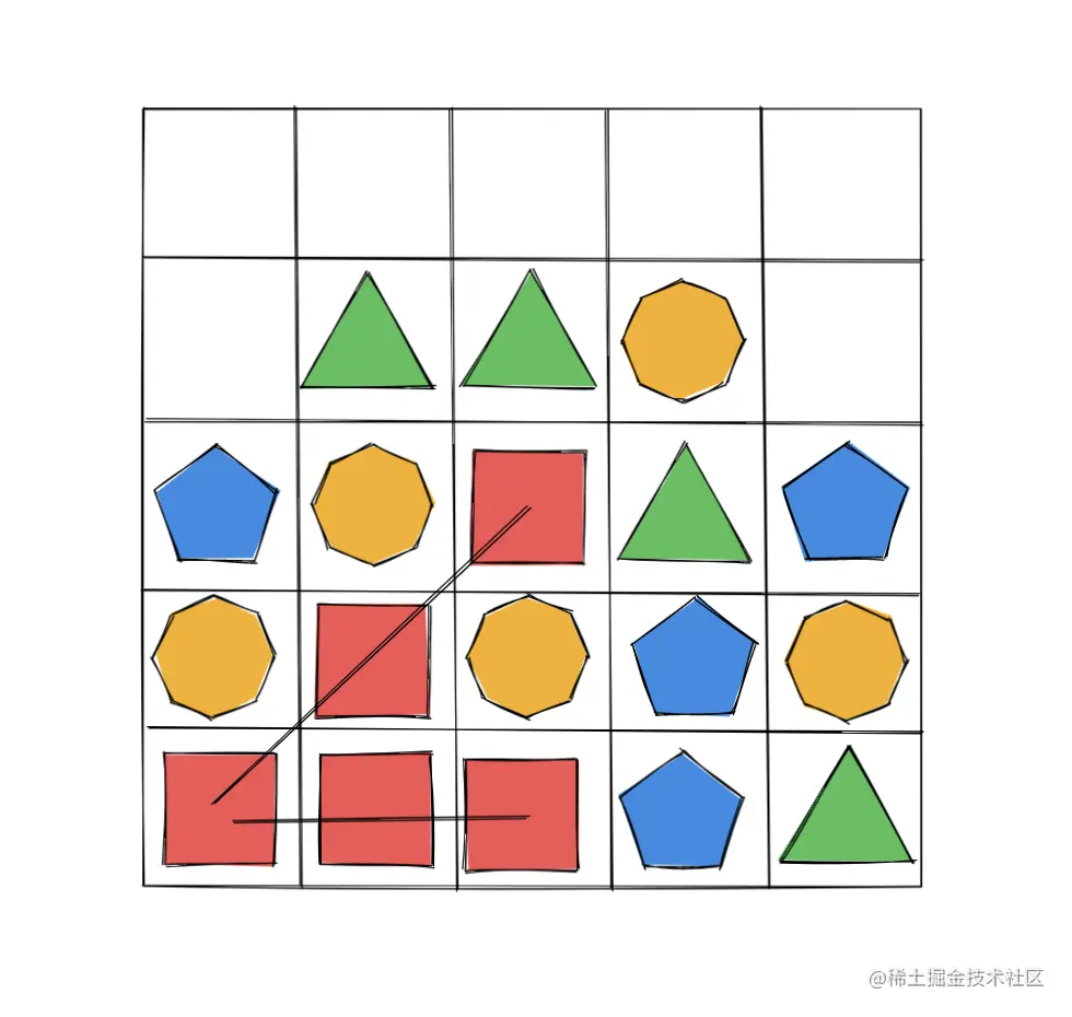 如图,用线画出来的红色宝石是满足消除条件的,它们会被消除,产生空白位置。消除过后,看起来是下面这样。