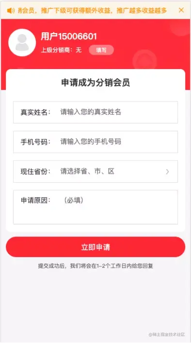 用户在商城端可以通过填写表单,申请成为分销会员。平台端会接收到用户提交的分销申请,审核通过后,用户即可成为分销会员。