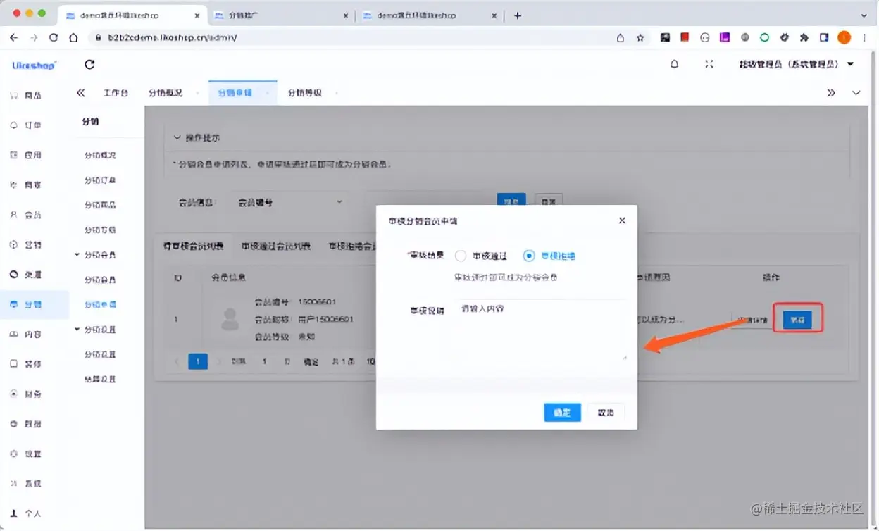 点击审核按钮,运营人员可以审核通过或者拒绝当前分销申请。