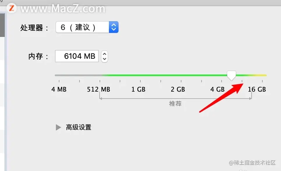 5、窗口右边可以滑动滑块来调整内存的大小,大小不要设置超过推荐的大小,否则会影响mac的运行性能。